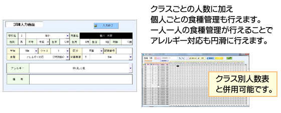 児童・生徒ごとにアレルギー情報を登録できる個人管理にも対応。