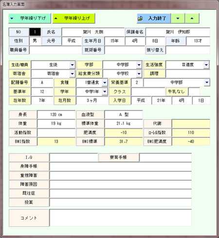 名簿データには喫食設定だけでなく、身長・体重などを含む詳細データの保存が可能です。